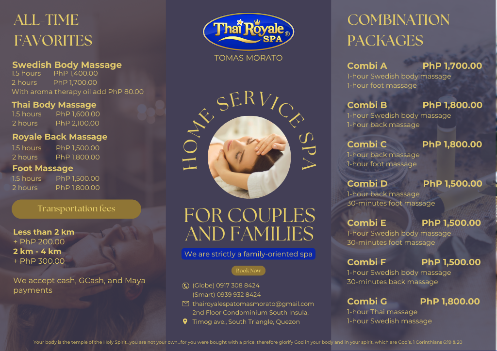 Thai Royale Spa Tomas Morato offers exceptional home service massage in Quezon City, providing a relaxing and rejuvenating experience in the comfort of your own home. With a team of skilled and professional therapists, they deliver a variety of massage treatments, including traditional Thai massage, Swedish massage, and Foot Massage, tailored to relieve stress, improve circulation, and promote overall well-being. Our home service ensures convenience for clients who prefer a private and personalized spa experience, making it easy to unwind without the need to travel. Thai Royale Spa is known for its commitment to customer satisfaction, offering a luxurious escape from the busy city life right at your doorstep.