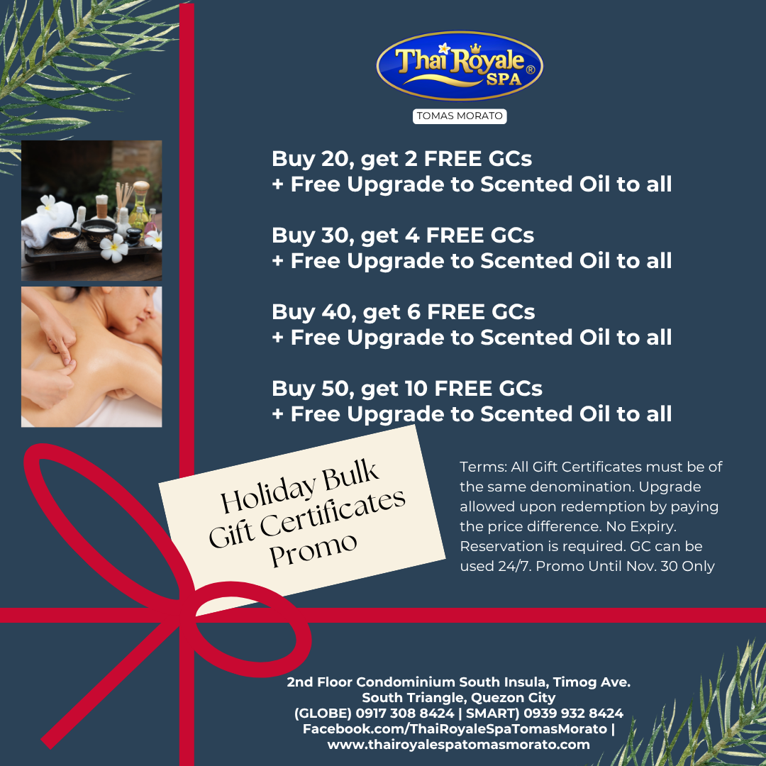 Thai Royale Spa Tomas Morato offers budget-friendly massage packages designed to make the benefits of massage therapy accessible to everyone. We’re dedicated to ensuring that you can enjoy a soothing, rejuvenating experience without breaking the bank.